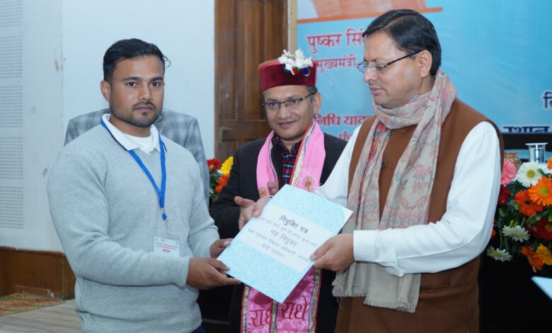 देहरादून। मुख्यमंत्री पुष्कर सिंह धामी ने रविवार को मुख्यमंत्री आवास स्थित मुख्य सेवक सदन में पंचायती राज विभाग द्वारा आयोजित नियुक्ति पत्र वितरण समारोह में पंचायती राज विभाग के 08 सहायक लेखाकारों तथा 342 ग्राम पंचायत विकास अधिकारियों को नियुक्ति पत्र प्रदान किये। सहायक लेखाकारों का चयन लोक सेवा आयोग तथा ग्राम पंचायत विकास अधिकारियों का चयन अधीनस्थ सेवा चयन आयोग के माध्यम से किया गया है। मुख्यमंत्री ने सभी चयनित कार्मिकों को शुभकामना देते हुए कहा कि नियुक्ति पाने वाले लेखाकार एवं ग्राम पंचायत विकास अधिकारी हमारी लोकतांत्रिक व्यवस्था के प्राथमिक इकाई ही नहीं इसकी नींव के समान है। पंचायती राज व्यवस्था जितनी सशक्त होगी हमारा लोकतंत्र भी उतना ही मजबूत होगा, तभी सुराज की परिकल्पना भी साकार हो सकेगी। उन्होंने कहा कि समाज के अंतिम छोर पर खड़े व्यक्ति की परेशानी, उसकी शिकायत को सरकार तक पहुंचाने और सरकार द्वारा किए जा रहे लोक कल्याणकारी कार्यों को जन-जन तक पहुंचाने में आप सभी की महत्वपूर्ण भूमिका रहती है।