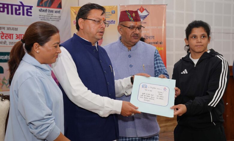 देहरादून। मुख्यमंत्री पुष्कर सिंह धामी ने सोमवार को मुख्य सेवक सदन में खेल नीति-2021 के  अंतर्गत विभिन्न पदों पर चयनित राज्य के 31 विशिष्ट खिलाड़ियों को खेल विभाग, गृह विभाग, युवा कल्याण एवं वन विभाग में आउट ऑफ टर्न सेवायोजन, परिवहन विभाग में 25 कनिष्ठ सहायकों तथा उद्यान विभाग में 28 सहायक लेखाकारों को नियुक्ति पत्र प्रदान किये। इस प्रकार कुल 84 अभ्यर्थियों को मुख्यमंत्री ने नियुक्ति पत्र वितरित किये। मुख्यमंत्री ने कार्यक्रम में सभी अभ्यर्थियों को बधाई एंव शुभकामनाएं देते हुये कहा कि आपने यह सफलता कड़ी मेहनत व परिश्रम से हासिल की है। उन्होंने  चयनित अभ्यर्थियों से अपेक्षा की कि वे अपने दायित्व का संवेदनशीलता, जिम्मेदारी और जवाबदेही के साथ निर्वहन करेंगे। उन्होंने कहा कि आप जितनी ईमानदारी, लगन और मेहनत से काम करेंगे, आपके आगे की राह उतनी ही सुगम और सरल होगी। मुख्यमंत्री ने खेल नीति 2021 का उल्लेख करते हुये कहा कि इसके तहत हमने अन्तर्राष्ट्रीय व राष्ट्रीय खेलों में पदक जीतने वाले खिलाड़ियों को आउट ऑफ टर्न सरकारी नौकरी देने का जो वादा किया था, उसे हम आज धरातल पर उतरते हुए देख रहे हैं। उन्होने कहा कि हमने तय किया है कि जो भी युवा खेल की दुनिया में उत्तराखंड का नाम रोशन करेंगे, उन्हें प्रोत्साहित किया जायेगा।