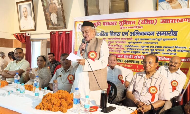 देहरादून। देवभूमि पत्रकार यूनियन (पंजी.) द्वारा पत्रकारिता दिवस एवं अभिनंदन समारोह मनाया गया। यह कार्यक्रम महावीर जैन कन्या पाठशाला, तिलक रोड, देहरादून में आयोजित की गई। कार्यक्रम में मुख्य अतिथि के रूप में भगत सिंह कोश्यारी (पूर्व राज्यपाल एवं पूर्व मुख्यमंत्री), डॉ. सुधा पांडेय (पूर्व कुलपति), विशिष्ट अतिथि के रूप में रवि बिजरानिया (उप-निदेशक सूचना एवं लोक संपर्क विभाग) मौजूद रहे एवं मुख्य वक्ता के रूप में डॉ. देवेंद्र भसीन (वरिष्ठ पत्रकार) और योगेश भट्ट ( सूचना आयुक्त उत्तराखंड सरकार) उपस्थित रहे।